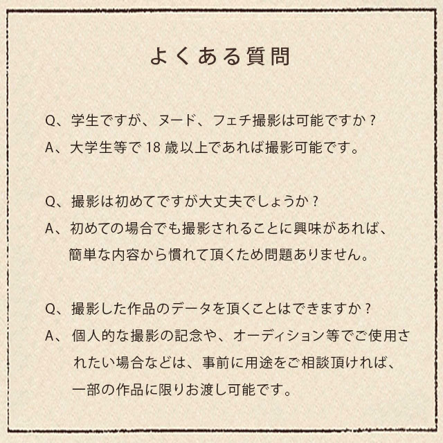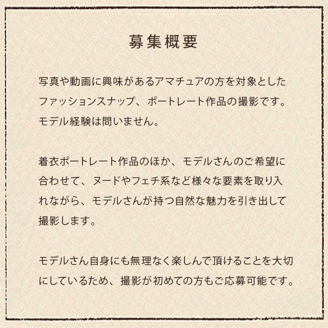 有名ファッションサイトの撮影経験もあるプロフォトグラファーが撮影。写真や動画に興味があるアマチュアの方を対象とした作品モデルを募集中です。